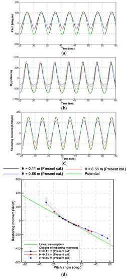 In this study, the time histories of the pitch motions, pitch moments, and restoring moments at T = 5.1 s, H = 0.11 m, 0.33 m, and 0.55 m were directly compared with the results based on linear potential theory, as shown in Figure 22, and the results were normalized to the wave heights. The time histories of the pitch motion, pitch moment, and restoring moment for the linear potential theory were estimated from the motion equation using the hydrodynamic coefficients of the frequency domain analysis, and the results were named as ‘potential’.