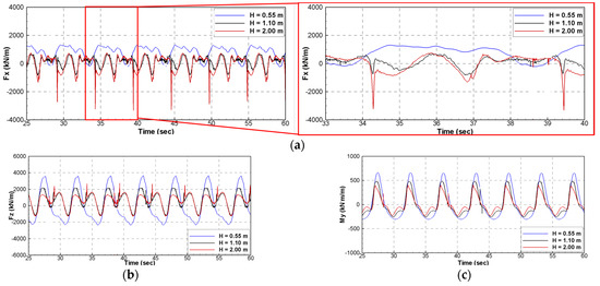 Figure 23 shows the representative time histories for each of the directional forces at T = 5.1 s and H = 0.55 m, 1.10 m, and 2.00 m. The forces were normalized to the wave heights. In the case of higher wave heights, it can be seen that the slamming impact forces occur by large pitch motions, as shown in Figure 23a,b. In the case of the horizontal force, it can be seen that the slamming impact force during a short time occurs approximately three times the static force, as shown in Figure 23a. Owing to the slamming impact forces, the time histories of the pitch moments in Figure 23c have non-sinusoidal shapes. The pitch motion of the rotor can be affected by the change in the restoring moment and non-linear phenomena. From the results, the non-linear phenomena probably lead to additional damping, as shown in Figure 17c, and the resonance period can be shifted to a relatively shorter period owing to the increase in the water mass by the wave runup. A high wave height can occur in a real sea; therefore, a non-linear motion analysis including the viscous, such as the CFD method, can be required in the designing phase of a rotor. From this study, it can be found that the variation of the pitch motions at relatively high wave heights can occur owing to the changing restoring moments and non-linear phenomena (e.g., wave runup and slamming).