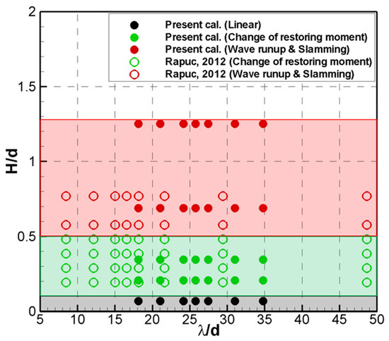 - According to the physical phenomena, the regions are classified into three types. In the case of H/d under 0.1, the linear potential theory, such as a frequency domain analysis, can be directly applied to estimate the pitch motions of the rotor. In H/d ranging from 0.1 to 0.5, a time-domain analysis could be used to estimate the pitch motions of the rotor by considering the changes in the restoring moments and wave exciting moments at large pitch angles. In addition, the time-domain analysis and a direct simulation using CFD could be used to estimate the pitch motions of the rotor. In the case of H/d over 0.5, where wave runup and slamming phenomena occur, CFD simulations should be used to estimate the pitch motions of the rotor.