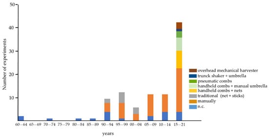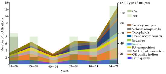 The more than 60 published studies since the pivotal work of García et al. [] are not evenly distributed over time but came in three waves (Figure 1). The first one was in the 1990s, during which the prospect for cold storage was evaluated for time spans up to 90 days and where the majority of the studies assessed the possibilities of CA. A second boost of studies arose from 2005 on, when CA became less prominent, and the mean maximum storage time was reduced to 30 days. Between 2015 and 2021 the number of publications doubled, while only marginal attention was given to CA, and the storage time was further reduced. From the second wave on, the type of analysis became not only more differentiated with an increasing focus on the phenolic and volatile compounds (Figure 1) but also more focused on the harvesting method. The last is in large part due to the progressive mechanization and the introduction of overhead mechanical harvesters in high-density orchards.