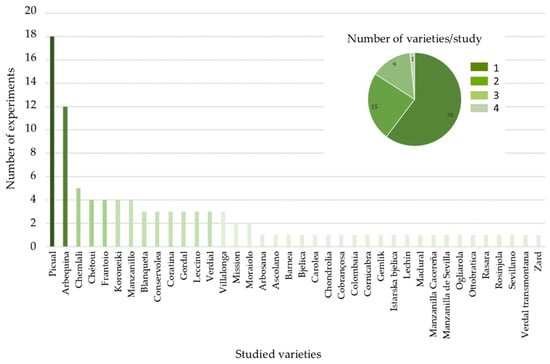 The ‘Picual’ and ‘Arbequina’ stand out as the most studied varieties with 18 and 12 experiments, respectively, followed by ‘Chemlali’ (5), ‘Chétoui’ (4); ‘Frantoio’ (4), ‘Koroneiki’ (4) and ‘Manzanillo’ (4) cultivars. More than half of the varieties appeared only in one experiment (22). 60% of the experiments were realized with 1 cultivar, and 24 and 14% with, respectively, 2 and 3 cultivars. Only one study took 4 varieties into account (Figure 2).