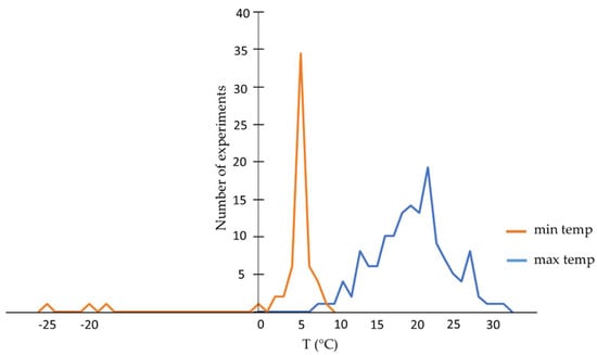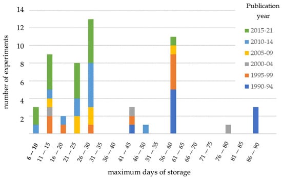 This wider range is partly explained because several studies took the mean maximum day and night temperatures into account or registered the temperatures over longer storages times. A minority of studies used intermediate temperatures of 8 °C [,,] and 10 °C [,].