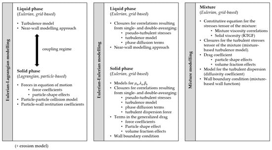 | Mixture modelling | Particle transport in pipes | Low computational cost Multiple solid phases allowed | Stringent assumptions on flow (local equilibrium approximation) |