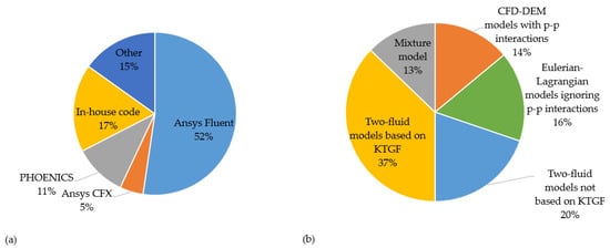 - Secondly, regarding the software used. As shown in Figure 15a, more than half of the investigations were performed using the Ansys Fluent code, which embeds all types of models described in Section 2; other commercial codes used were PHOENICS and Ansys CFX. A significant fraction (≈17%) of the numerical studies were performed using in-house codes, which mostly applies to the pioneering investigations. The category field “other” in Figure 15b include papers in which the use was made of a combination of different open source or commercial software, as well as those where no information was provided.
