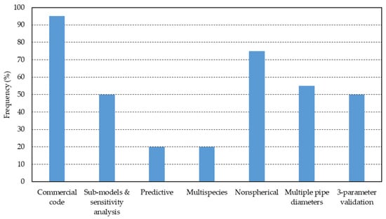 - Thirdly, regarding the modelling approach. As shown in Figure 15b, Eulerian–Lagrangian models, either including or ignoring particle–particle interactions, were used in around 30% of the total published articles, indicating that the Eulerian approach is the preferred one for the modelling of slurry pipe flows. However, the data must be interpreted in the light of the topic of the study: in fact, almost all papers concerning slurry erosion used the Eulerian–Lagrangian models, whereas the slurry transport at high concentrations has been rarely simulated using this approach. It is also interesting to underline the relation between the type of modelling approach and the used software: for instance, almost all investigations using two-fluid models based on KTGF and those using the Mixture Model were performed with Ansys Fluent. Conversely, although particle–particle interaction models are embedded in most commercial codes, CFD-DEM simulations have been usually run by coupling different codes, or with a single in-house package.