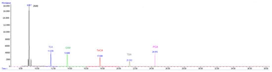 GC-MS analysis was performed with an Agilent 6890 N chromatograph equipped with a Gerstel MPS2 auto-sampler and coupled to an Agilent 5973 N mass spectrometer. The separation was achieved using an HP-5MS column (30 m, 0.25 mm, 0.25 µm film thickness) (J&W Scientific, Folson, CA, USA) and a GC oven program starting at 55 °C (3 min), increased by 15 °C min−1 to 125 °C, 1.5 °C min−1 to 145 °C, 10 °C min−1 to 183 °C, 1.5 °C min−1 to 195 °C and 15 °C min−1 to 250 °C (held for 3 min). The carrier gas was helium (99.999%) from Abello Linde (Barcelona, Spain) with a constant flow rate of 1 mL min−1. The transfer line temperature was set at 300 °C and the ion source temperature at 250 °C. The mass spectrometer was operated in selected ion monitoring mode (SIM) detecting the following ion masses: 195 and 210 of TCA, 231 and 246 of TeCA, 346 and 331 of TBA, 280 and 265 of PCA, 112 and 125 of GSM and 95 of 2MIB. GC-MS chromatogram with selected compound peaks and retention times were showed in Figure 1.