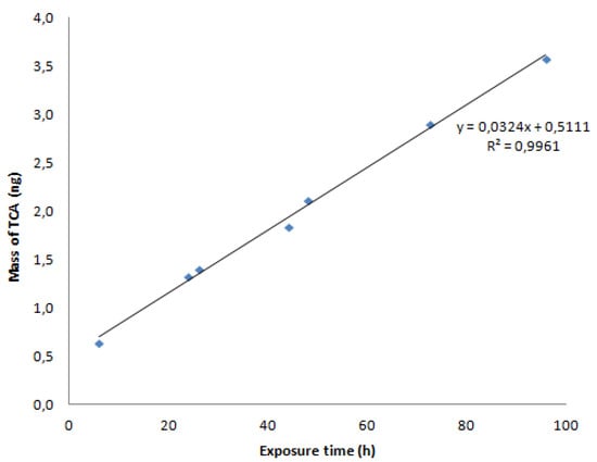 The response of these tubes (mainly from 2 to 54 or 72 h) showed good linearity with a coefficient of determination (R2) between 0.996 to 0.999 for all compounds. The R-values calculated from the correlation graph’s slope and average Cair were from 0.013 to 0.071 m3 h−1. An example of a calibration curve obtained for calculating the R-values (in the case of TCA) is presented in Figure 2.