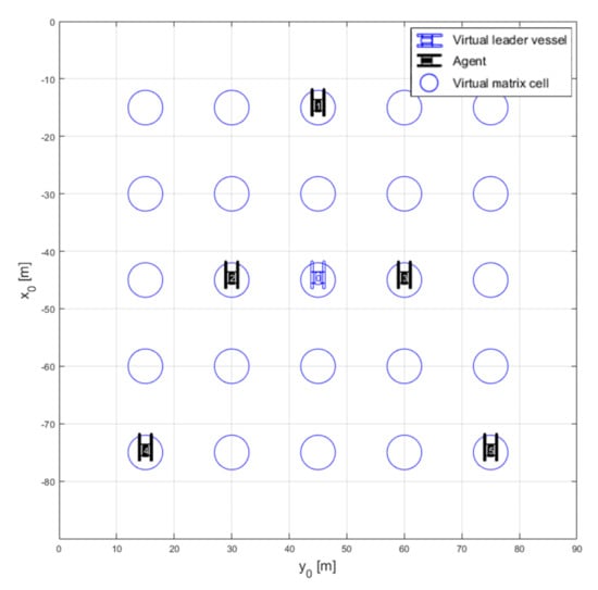 Figure 2 shows the virtual leader vessel and the 5 × 5 virtual matrix that is created. The virtual leader vessel is represented by a blue vessel to distinguish it from the agent. The drow and dcol of the virtual matrix are set to 15 m each. Further, each agent is provided a cell number of the virtual matrix [(1,3), (3,2), (3,4), (5,1), (5,5)].