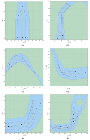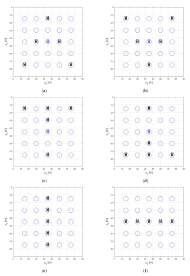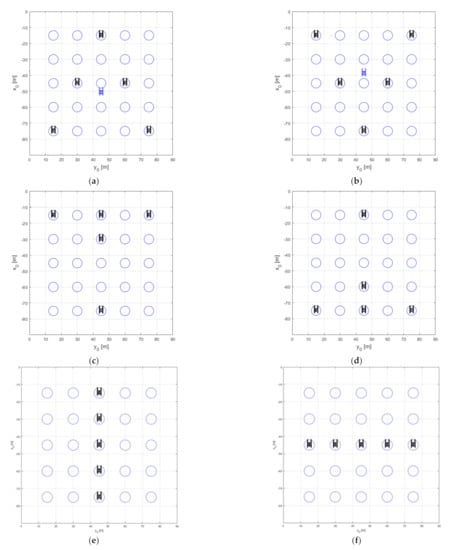 The cases shown in Figure 3a–f represent the wedge, inverted wedge, T, inverted T, column, and row formations, respectively. Table 2 lists the virtual matrix cell number according to each formation. When the virtual leader vessel (with the virtual matrix attached) follows the global waypoint, which is the way point of the entire formation, the agent tracks the coordinates of a particular cell number that is provided to each agent. Therefore, the formation is maintained during operation. Through this process, the cell number designated to the agent changes if the formation changes, and agents move to change their location in the virtual matrix while the matrix works as a rigid body.