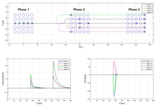 Figure 4 shows the simulation results to verify the formation-transform performance of swarm control with the virtual matrix approach. The formation-transform simulation comprises phase 1 forming the column formation, phase 2 forming the wedge formation, and phase 3 forming the row formation. Agents 1–5 were assigned different cell numbers according to the phase, as shown in Table 3. The virtual leader vessel (blue) is in cell (3,3) of the matrix. During a phase change, the agents follow the designated cell by the LOS guidance algorithm, while the heading angle and speed are controlled via PID. Accordingly, the formation is transformed and centered on the virtual leader vessel.