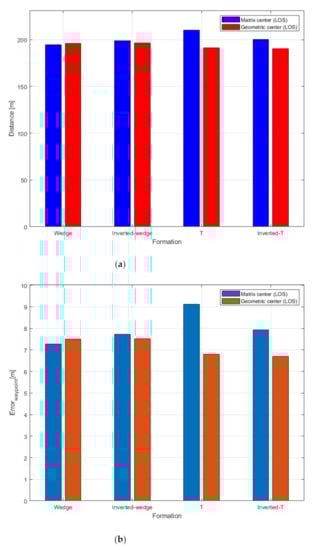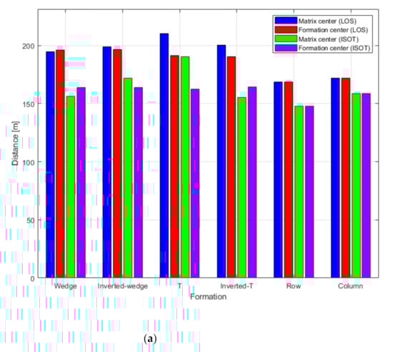 The combination of the algorithms and the derived virtual leader vessel position can be expressed by four cases: MC + LOS, LOS + GC, MC + ISOT, and ISOT + GC. Table 4 shows the results of analyzing these four cases by formation, as described in Section 3.3. When ISOT guidance was followed in all formations, both the MC and GC distance decreased compared to LOS guidance. It was confirmed that the average decreased by 14.24% and 13.68% for MC and GC, respectively. Further, battery usage also decreased by 21.66% and 20.59% for MC and GC, respectively, suggesting that the ISOT guidance algorithm is more efficient than LOS guidance. In contrast, the error up to the waypoint increased by 23.78% and 24.47% for MC and GC, respectively, confirming that the ISOT guidance robustness is lower than that of LOS guidance. Figure 12 shows the values in Table 4 as a bar graph. The first and second bars of each formation show the MC and GC cases based on the LOS guidance algorithm, whereas the third and fourth bars show the MC and GC cases based on the ISOT guidance algorithm.