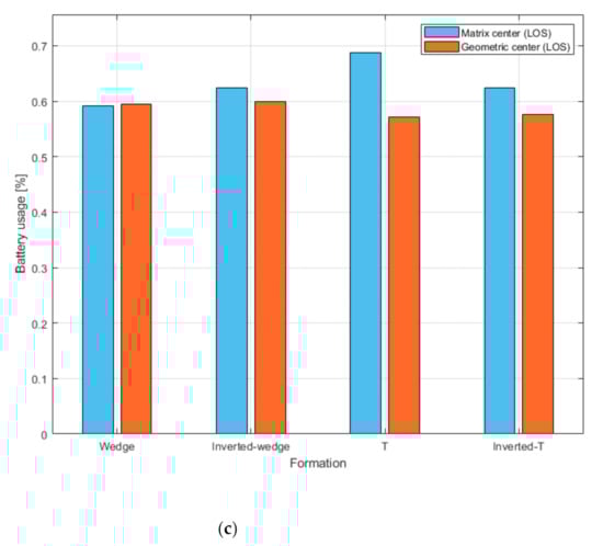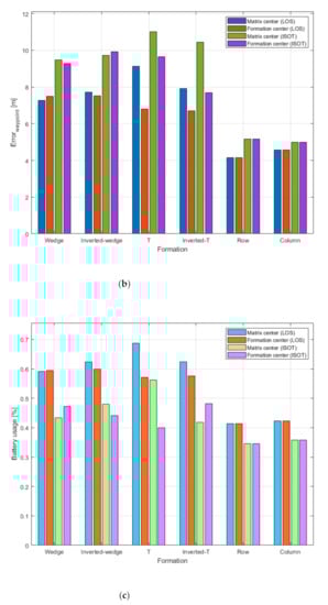 (a) Distance average of the agent according to formation using LOS, ISOT guidance. (b) Error waypoint average of the agent according to formation using LOS, ISOT guidance. (c) Battery usage average of the agent according to formation using LOS, ISOT guidance.
