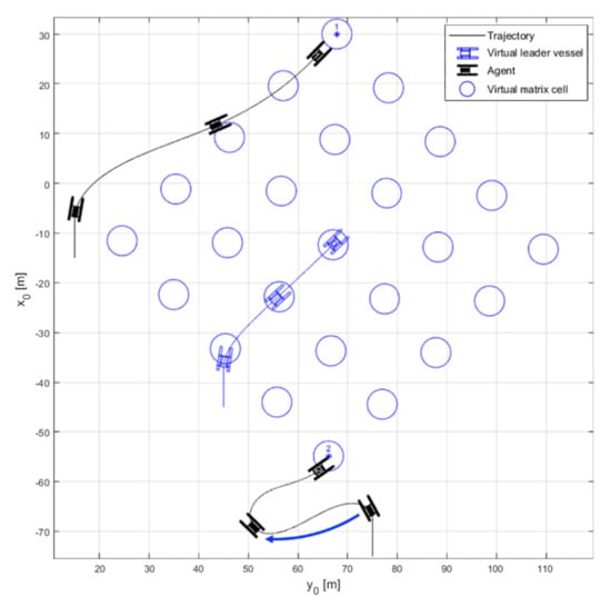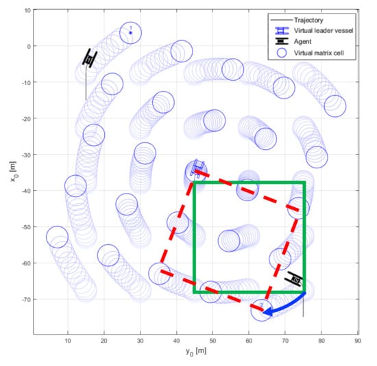 The key to the swarm operation is easy formation change and maintenance. For this purpose, a virtual matrix approach is proposed in this study. The virtual matrix is generated as an n × m matrix, based on the location information of the virtual leader vessel. The size of the virtual matrix, the distance drow between rows, and the distance dcol between columns can be set according to the formation. Further, the coordinates of each cell in the matrix are calculated according to the virtual leader vessel position, drow and dcol. Therefore, when the virtual matrix and the virtual leader vessel are determined, each agent is provided a cell number to be located on the virtual matrix according to the formation.