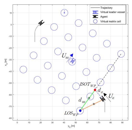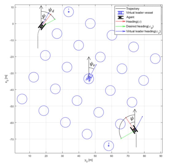 The ISOT guidance algorithm was introduced to eliminate such inefficient maneuvers. As shown in Figure 9, the angle ψv between the x-axis of the earth-centered fixed-coordinate system and the blue arrow is the heading angle of the virtual leader vessel and the rotation angle of the virtual matrix. Further, the angle ψ between the x-axis of the earth-centered fixed-coordinate system and the red arrow is the heading angle of each agent. The angle ψd between the x-axis of the earth-centered fixed-coordinate system and the green arrow is the desired heading angle of each agent calculated by the LOS guidance algorithm.