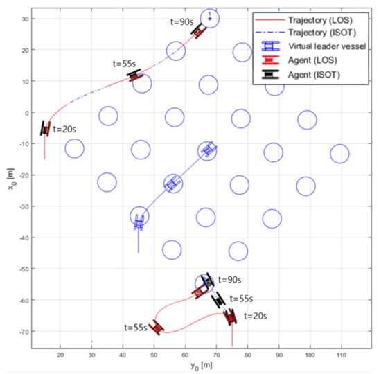 Figure 11 shows time trajectories of the LOS and ISOT algorithms. The agent following the LOS guidance is shown in red, and the trajectory is indicated by a red line, while the agent following the ISOT guidance is black, and the trajectory is indicated by a blue dotted line. At 20 s, the virtual leader vessel and virtual matrix rotate. If the agent follows the LOS guidance, the agent operates inefficiently because it follows the rotating virtual matrix. However, if the agent follows ISOT guidance, it operates efficiently by moving the minimum distance at the optimal speed. In the case of agent 1, because |ψv − ψd| is within 90°, both LOS and ISOT generate the same waypoint.