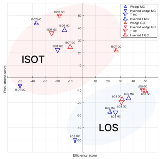 Comparison of the LOS and ISOT guidance algorithms in terms of efficiency and robustness score.