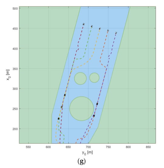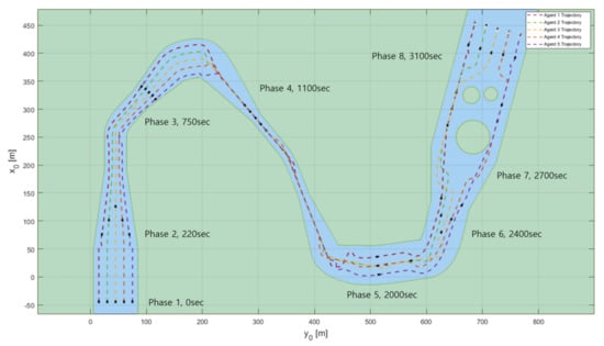 Figure 14 shows a simulation that includes both changing the distance between the rows and columns of the virtual matrix and the formation transform of the swarm operation. An arbitrary map was created, and a swarm simulation was performed based on the map. The swarm simulation consisted of a total of eight phases, the total simulation time was 3300 s, and the ISOT guidance algorithm was applied with the virtual leader vessel located in the GC. The various phases were as follows: phase 1, row formation; phase 2, wedge formation; phase 3, narrow row formation; phase 4, column formation; phase 5, inverted T formation; phase 6, inverted wedge formation; phase 7, evasion formation to avoid islands; and phase 8, widened row formation. The distance between the columns of the virtual matrix decreased and increased in accordance with the width of the river by the specified value, indicating the convenience and user-friendly features of the virtual matrix approach. The simulation conditions for each phase are summarized in Table 5. Figure 15 shows a snapshot of each phase.