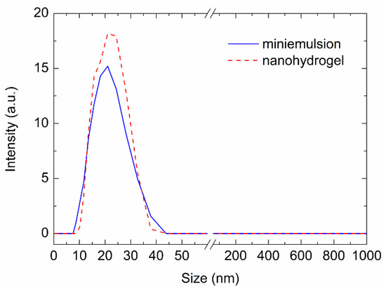 Comparison between miniemulsion droplet (sample M6) and nanohydrogel (sample H2) dimensional distributions obtained by DLS. The templating effect of miniemulsion is highlighted by the overlapping of the two curves.
