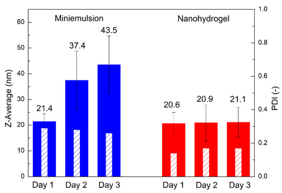 Comparison between miniemulsion (sample M6) and nanohydrogel (sample H2) size (left-hand y axis) and PDI stability (right-hand y-axis) over time.