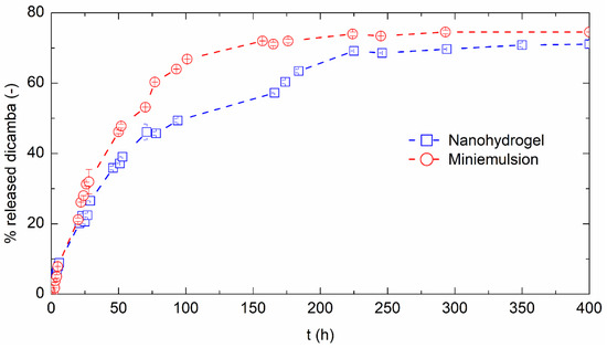 Cumulative percentage of non-encapsulated and encapsulated released dicamba. The percentage was calculated taking the dicamba mass loaded in the miniemulsion/nanohydrogels as a reference.