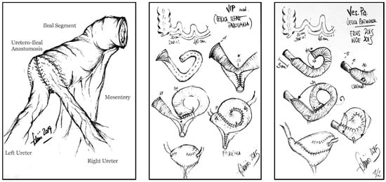 On the other hand, bladder cancer is one of the most frequent causes for bladder removal through radical cystectomy, the gold standard treatment for localized muscle-invasive bladder cancer, when conservative treatments such as chemo- and radiotherapies are not effective. In the European Union, the incidence of bladder cancer is in the sixth place and the age-standardized incidence rate of bladder cancer is 19.1 for men and 4.0 for women [1,2]. Unluckily, radical cystectomy is one of the more morbid urologic operations, with 80% of complications [3]. In men, this procedure involves the removal of the prostate, seminal vesicles, distal ureters and regional lymph nodes, while in women, the entire urethra and adjacent vagina, uterus, distal ureters and regional lymph nodes are excised. After radical cystectomy, three kind of urinary diversions are possible: (i) abdominal diversion, such as ureterocutaneostomy, colonic or ileal conduit, (ii) various forms of a continent pouch created using different segments of the gastrointestinal system and a cutaneous stoma, and (iii) orthotopic urinary diversion using an intestinal segment with reconfiguration and anastomosis to the ureters and urethra (neobladder, orthotopic bladder substitution) (Figure 1) [1].