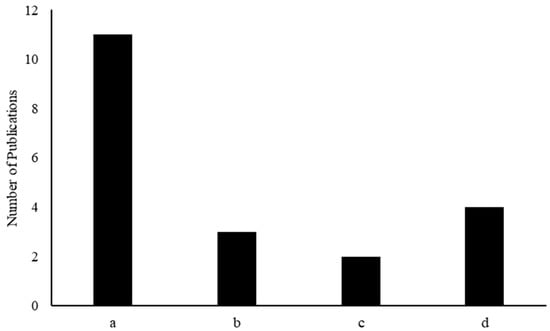The number of publications related to the effects of frying processes on the nutritional and sensory characteristics of mackerel (a), mackerel with marinade and spice (b), mackerel with batter (c), and minced mackerel products (d).