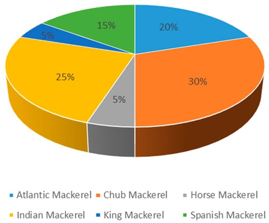 Mackerel is a pelagic fish, belonging to the family Scombridae, which lives in the open ocean, including the Pacific, Indian, and Atlantic Oceans. According to Froese et al. [1], mackerel has a streamlined body, a silvery white belly, and a darker back, which is usually black mottled. The large eyes, long heads, and teeth in a large mouth are the main morphological characteristics of these fish. They also have two triangular fins on the dorsal side and some stabilizing fins along the caudal peduncle.