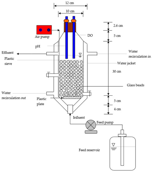 A schematic laboratory-scale completely mixed and continuous-flow bioreactor is shown in Figure 2. The system was a cylinder made of glass with an acrylic stand. The dimensions of this reactor were 10 cm internal diameter and 46.6 cm height with a liquid level of 30 cm, providing a total volume of 2.4 L. A working volume of 1.568 L yielded a hydraulic residence time of 6 h in the present study. Approximately 44% of the working volume (i.e., 690 cm3) was filled with glass beads with a diameter of 3 mm. The required air for the system was supplied by an aerated plate and one air aquarium compressor with an output air capacity of 30 L/min to maintain the dissolved oxygen at 2.3 ± 0.2 mg/L The reactor was maintained at 30 ± 0.1 °C through a water jacket using a circulating water bath (Yih Der Inc., Taipei, Taiwan). The influent was provided at the bottom of the reactor using a digital peristaltic pump (Model HT100IJ, Longer Pump) with an influent flow rate of 6.272 × 103 mL/d. The influent feed was synthetic wastewater containing phenol plus 4-CP as dual substrate for biodegradation [2]. The pH was buffered at 7.1 ± 0.2 by HPO42−/H2PO4− in the feed solution. Control tests were also undertaken using glass beads without cells to evaluate whether the glass beads contributed to removing phenol plus 4-CP in the continuous-flow biofilm reactor.