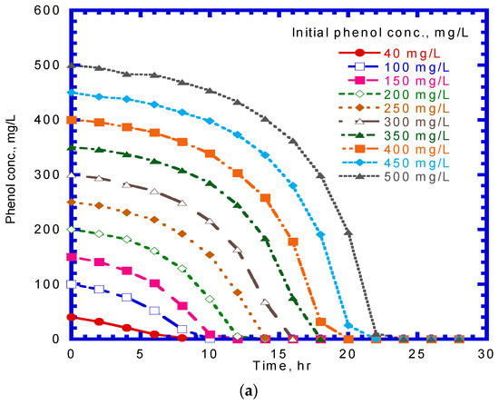 Phenolic and chlorophenolic compounds as intermediate products are present in pesticides, pharmaceuticals, insecticides, fungicides, etc. These compounds are difficult to remove owing to their toxic properties [1,2]. Conventional treatment methods such as adsorption, chemical oxidation, and electrochemical oxidation exhibit high removal efficiencies with various phenolic and chlorophenolic compounds; however, these methods have several drawbacks, such as high operation costs, toxic intermediate products, incomplete mineralization of the compounds, and the high disposal cost of chemical waste sludge [3]. Biological processes to treat phenolic and chlorophenolic compounds containing environmentally friendly and low-cost properties have been reported [4,5,6]. The application of biological processes to treat phenolic and chlorophenolic compounds in wastewater has gained much attention. Many researchers have performed kinetic studies of single- and dual-substrate biodegradation to improve our understanding of the detailed performance of biological processes.