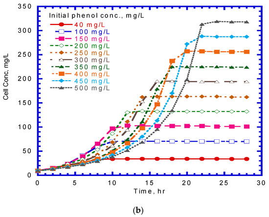where is the maximum specific growth rate of cells on phenol (h−1), is the half-saturation constant of phenol (mg/L), and is the self-inhibition constant of phenol (mg/L). The growth pattern of cells on phenol biodegradation can be described with the following equation [18]: