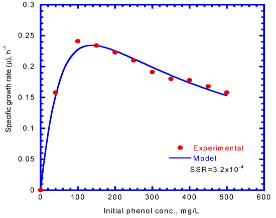 Specific growth rate versus initial phenol concentration, fitted by the Haldane model to determine the maximum specific growth rate on phenol (), half-saturation constant for phenol ( ) and self-inhibition constant of phenol ( ).