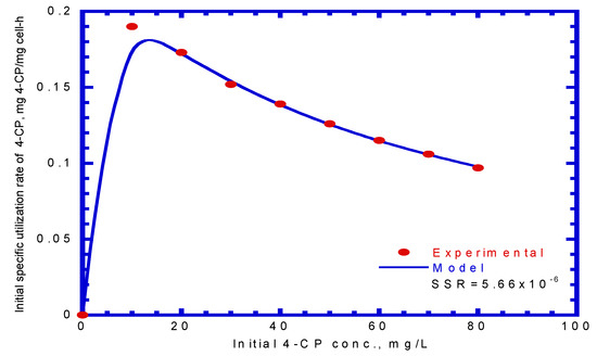 The kinetics of 4-CP transformation by resting cells obtained from the growth substrate was used to determine the maximum specific utilization rate of 4-CP (), half-saturation constant of 4-CP () and self-inhibition constant of 4-CP () [19]. The form of the kinetic model expressing the specific transformation rate of 4-CP using the resting cells of P. putida is described as follows [16]: