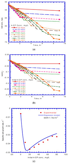To evaluate the values of the true transformation capacity () and first-order endogenous decay coefficient (), the time-course variation of cell concentration at various initial nominal 4-CP concentrations is illustrated in Figure 7a. The experimental results are consistent with those reported by Miri et al. [19] who used toluene, benzene and ethylbenzene-assimilating resting cells to undertake with the cometabolic transformation of p-xylene. The negative values of the specific growth rate were determined by plotting ln (X/X0) against time (Figure 7b). Equation (5) was then used to fit the experimental profile of the change in the specific growth rate to determine the and values using the non-linear least square method by minimizing the SSR value (Figure 7c). The and values were 4.34 mg 4-CP/mg cell and 5.99 × 10–3 h–1, respectively, with an SSR value of 1.78 × 10−4. The specific growth rate of resting cells can be expressed as: