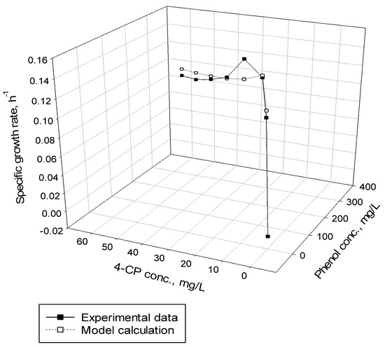 where and are the specific degradation rates of phenol and 4-CP, respectively (mg substrate/mg cell-h); and are the phenol and 4-CP concentrations in the batch reactor, respectively (mg/L); and are the maximum specific utilization rates of phenol and 4-CP (mg substrate/mg cell-h), respectively; and are the half-saturation constants for phenol and 4-CP degradation, respectively (mg/L); and and are the competitive inhibition coefficients of phenol and 4-CP, respectively (mg/L) [23].