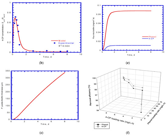 The growth of the biofilm is shown in Figure 10c. A lag phase of 0.5 days was observed for the P. putida biofilm, which started to grow and then followed the exponential phase. The model predicted that the biofilm thickness was 338.5 µm on day 8. The experimental data and model predictions for suspended P. putida cells in the bulk liquid are shown in Figure 10d. The biofilm and suspended cells contributed to degrading the phenol and simultaneously performed a cometabolic transformation of 4-CP during the biofilm process. A lag stage of 0.5 days was also observed, followed by an intensive and mild log-growth phase. The effluent concentration of the P. putida suspended cells was approximately 43.36 mg/L on day 8.