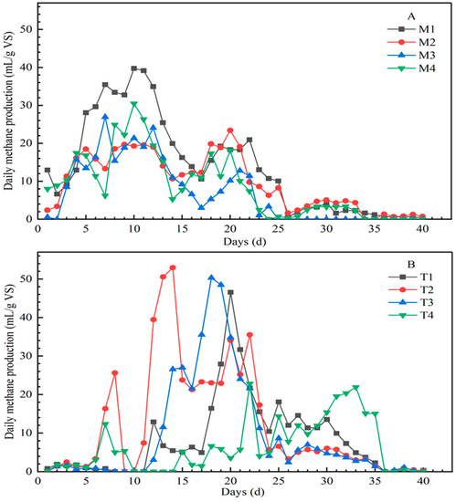 Daily methane production from different mixtures of substrates under mesophilic conditions (A) and thermophilic conditions (B) (note: the data were the mean of three repetitions).