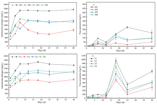 Concentrations of ammonium nitrogen (AN) and free ammonia (FA) under mesophilic conditions (A,a) and thermophilic conditions (B,b) (note: the data were the mean of three repetitions, and error bars indicated standard deviation. A and a represent concentrations of AN and FA at mesophilic conditions, B and b represent concentrations of AN and FA at thermophilic conditions.).