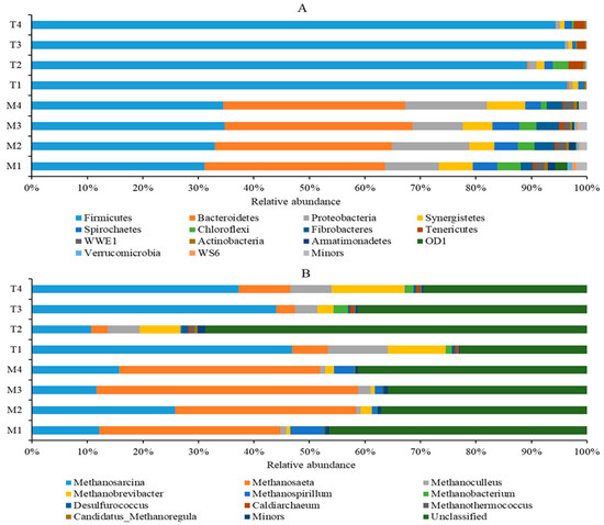 First, the quantitative insights into microbial ecology (QIIME) software was used to identify and eliminate suspicious sequences, and a total of 383,347 bacterial sequences and 444,654 archaeal sequences were obtained by statistical analysis of eight samples. Then, these sequences were clustered into operational taxonomic units (OTUs) with 97% similarity, resulting in 2684 bacterial OTUs and 2507 archaeal OTUs. The relative abundances (RA) of bacteria and archaeal communities for different sets are provided in Figure 4. The bacterial OTUs were further classified into 35 phyla. At the phylum level, the most abundant bacteria were Firmicutes (31.10–34.80%), Bacteroidetes (31.86–33.76%), Proteobacteria (9.13–14.75%), Synergistetes (4.51–6.68%), and Spirochaetes (2.89–4.85%) in reactors under 35 °C. However, it is interesting to note that Firmicutes played the dominant role in reactors under 55 °C, with the RA of 96.50%, 89.22%, 96.00%, and 94.32% for T1 to T4, respectively.