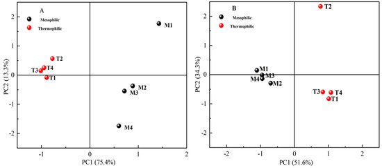 Simpson and Shannon indexes reflected community diversity, and the greater these values were, the higher the microbial diversity. In this study, the diversity of the bacterial community was higher than that of the Archaea community (in Table 4). M1 and T2 had the highest microbial community diversity. Except for T2 reactor, the microbial community diversity of mesophilic reactors was higher than that of thermophilic reactors. Beta diversity was concerned with microbial similarities between communities, and the similarity of microbial communities was high between treatments with similar distance in the co-ordinate system. Principal component analysis (PCA) was conducted based on the RA of microbial OTUs (Figure 5) and the results indicated that, compared with chemical components, the effects of temperature treatment on the microbial community were more significant. In addition, the differences between M1 and other treatments were significant, and T2 was isolated from other treatments.