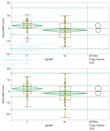 There is some indication of a significant difference due to sex although the results for both male and female cohorts meet the accuracy (MAE) guidelines. There is more variance for the male subset which exceeds the target of SD ≤ 8 mmHg for SBP. The results are shown in Table 8 and Figure 6.