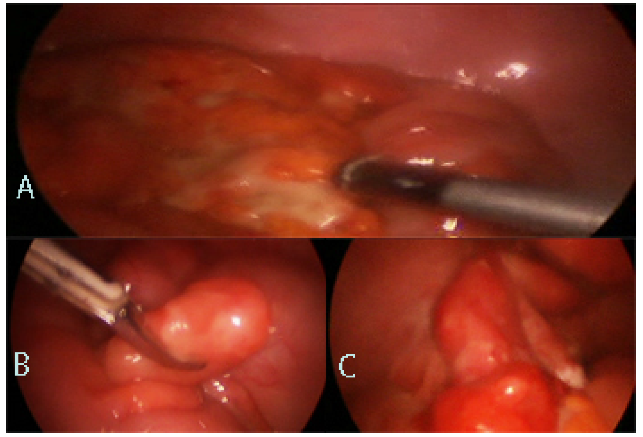 th day of her menstrual cycle. She did not have medical history of gynecological problems or any major medical diseases – diabetes mellitus, cardiovascular or renal issues. The abdominal examination revealed pain in the lower abdomen, muscle rigidity and rebound tenderness. During gynecological examination, the patient had pain in the left fallopian tube and cavum Douglasi. Transvaginal sonography showed free fluid in cul-de-sac, thickness and hyperechoic structures on the wall of the left fallopian tube. Laboratory data results revealed leukocytosis accompanied by a left shift, hypoproteinemia, hypoalbuminemia and high levels of fibrinogen. Pelvic inflammatory disease was suspected and after surgical examination, we admitted the patient in the gynecology clinic. Immediately after hospitalization culdocentesis was performed. We aspirated 60 mL purulent material from the cavum Douglasi and sent it for aerobic and anaerobic pathogenic cultures. Initial empirical antimicrobial therapy was initiated immediately: gentamicin (120 mg every 12 h, i.m.), cefazolin (2 g every 12 h, i.v.), metronidazole (500 mg every 8 h, i.v.). Empirical antimicrobial therapy was continued for 48 hours, until microbiological results became available. On the second day the patient got worse: the temperature increased to 39 °C and vomiting, abdominal pain and reduced intestine peristalsis occurred. Abdominal X-ray and surgical examination were ordered to evaluate alimentary tract obstruction or perforation. Abdominal X-ray showed air-fluid levels in the intestine without free gas under the diaphragm. Our conclusion was that she might be suffering from generalized peritonitis due to gynecological pathology. The patient underwent diagnostic laparoscopy. She was informed that there is a possibility for conversion from laparoscopic to open surgery. We performed the open technique method of first port insertion in order to avoid bowel perforation. Intraoperative findings included: around 300 mL purulent fluid and fibrinous adhesions in the peritoneal cavity, small bowel dilation, edematous left fallopian tube and fibrinopurulent exudate on serosa of the appendix, without perforation (