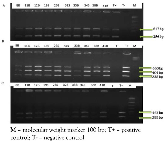 A) PCR amplification of virulence inl A and inl C genes; B) PCR amplification of virulence act A, hly A and inl J genes. C) PCR amplification of virulence plc B, prf A genes.