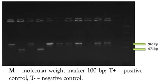 From 140 analyzed beef meat samples, 48 strains had the morphological aspect of L. monocytogenes, in which ten have been confirmed by PCR (Figure 1). L. monocytogenes was detected in 7.14% of analyzed samples (10/140). The L. monocytogenes strain ATCC 19112 was used as a reference.
