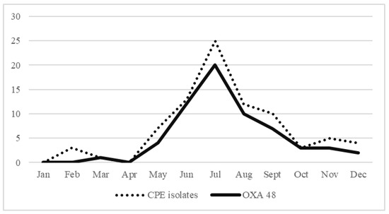 Number of total CPE isolates per month in 2018 (dots) and number of OXA-48 isolates per month in 2018 (full line).