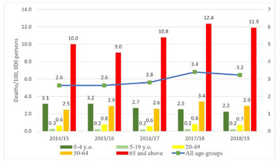 The estimations showed a negative trend for the 0-4 age group, log(Mt) = 1.779 - 0.040 * t and for the 65+ age group, log(Mt) = 2.250 + 0.034 * t, respectively. Then, a number of 22 deaths were estimated for the first group and 428 for the last one. Summing the estimated deaths from all age groups, a total number of 625 deaths were counted for the entire 2018/19 season.