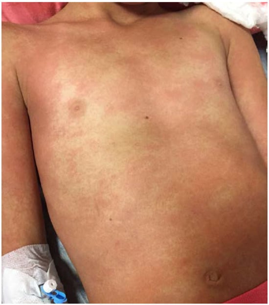 A previously healthy 7-year-old girl visited her family physician with fever and sore throat lasting for four days and was started on amoxicillin clavulanic acid treatment with a diagnosis of acute tonsillitis. She was then referred to our hospital because of the persistent fever and maculopapular rash on the second day of treatment. At admission physical examination revealed fever (39 °C, axillary) and maculopapular rash involving the whole trunk, extremities and face. The rash was more prominent on extremities (Figure 1).