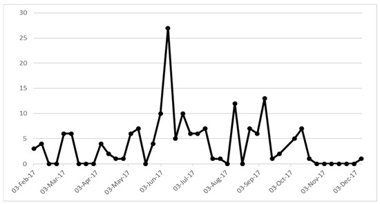 Weekly number of cholera infections (based on the date of hospitalization) in the study site, 3rd February 2017 and 8th December 2017.