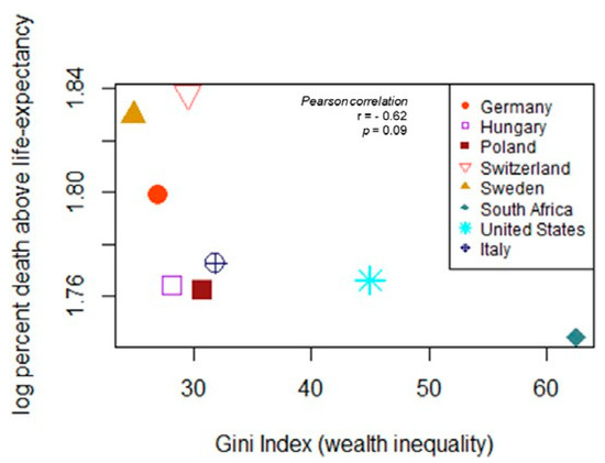 Results: Given this dataset, it was observed that there was a greater proportion of COVID related deaths above life expectancy (M=64.58%, SD=6.46) as opposed to below life expectancy (M=35.41%, SD=6.46), as these differences were significant (95%CI [18.518, 42.881], p<0.001). In contrast, an insignificant trend was observed when examining the relationship between deaths above life expectancy and Gini index (Pearson correlation coefficient r= -0.62, n=8,