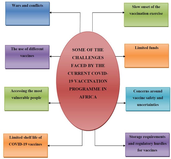 Despite the landmark achievements in the procurement of COVID-19 vaccines, and the initial progress made at the beginning of the vaccination exercise, the vaccination momentum is subsiding presently in Africa. For instance, because of numerous factors, less than 1% of the total COVID-19 shots administered in the world have been given in the continent [17]. Highlighted below are some of the challenges hindering the successful implementation of the immunization programme against COVID-19 in Africa (Figure 1).