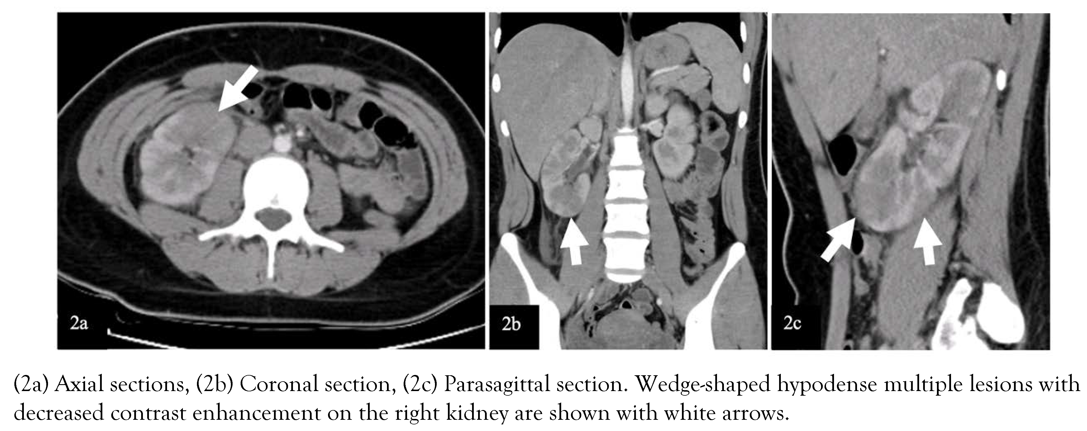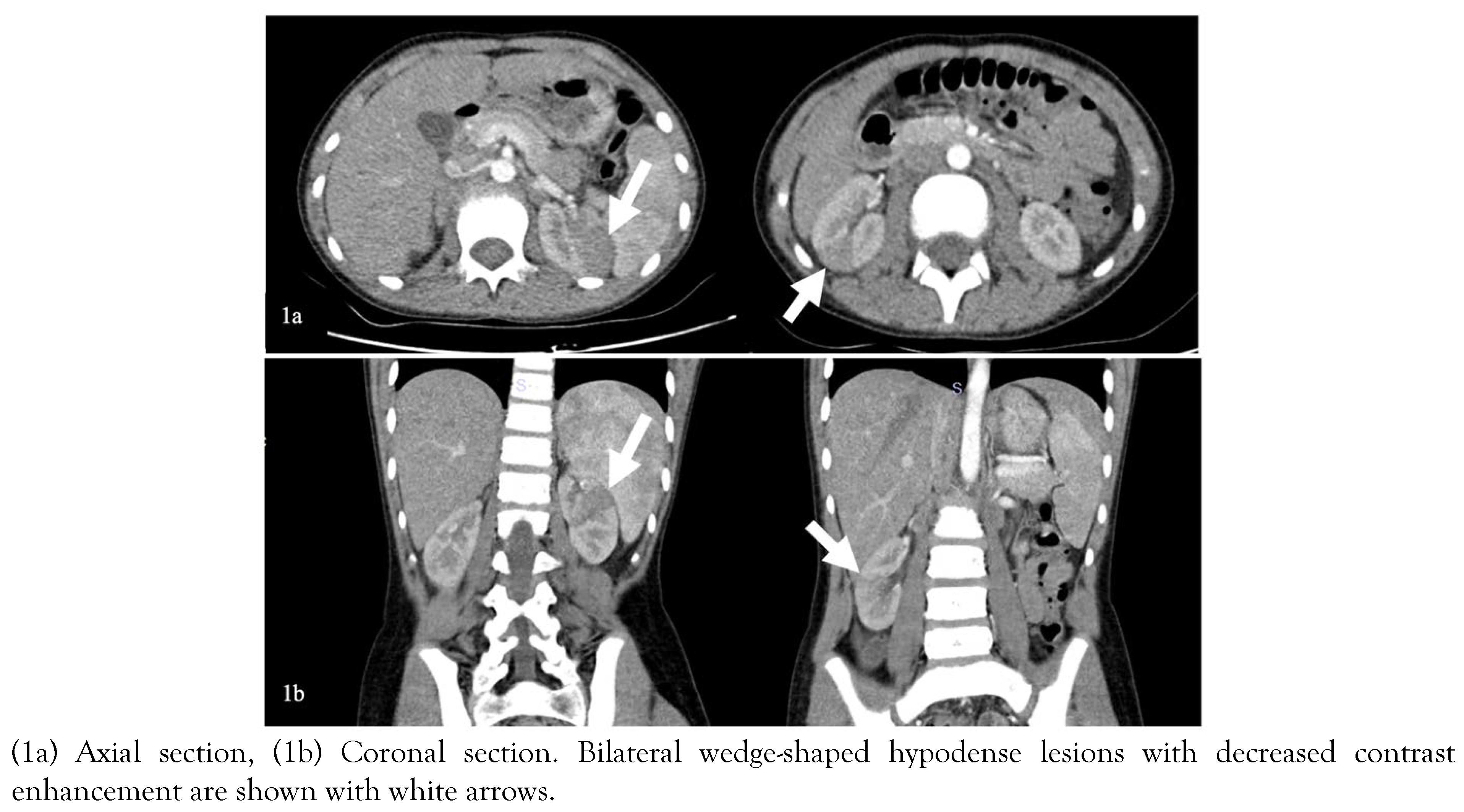 Due to the acute abdomen clinical finding in Case-2 and the significant CVA tenderness in both cases (bilateral in Case-1 and unilateral in Case-2), contrast-enhanced abdominal computed tomography (CT) was performed for differential diagnosis. In Case-1, nonhomogeneous hypodense mass-like lesions with decreased contrast enhancement in both kidneys were detected (
